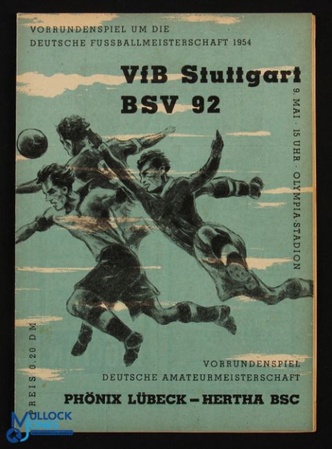 1953/54 VfB Stuttgart v BSV 92 match programme at the Olympic Stadium 9 May 1954; also includes Phoenix Lubeck v Hertha BSC and Alemannia v 1 FC Saarbrucken; good. (1)