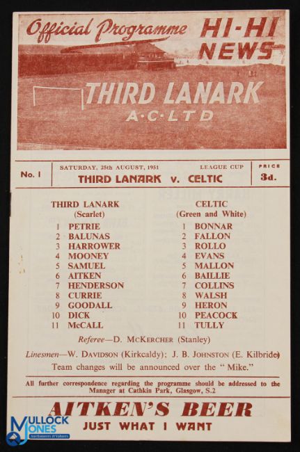 1951/52 Third Lanark v Celtic Scottish League Cup match programme 25 August 1951; slight crease, tiny nick to back page; o/wise good. (1)