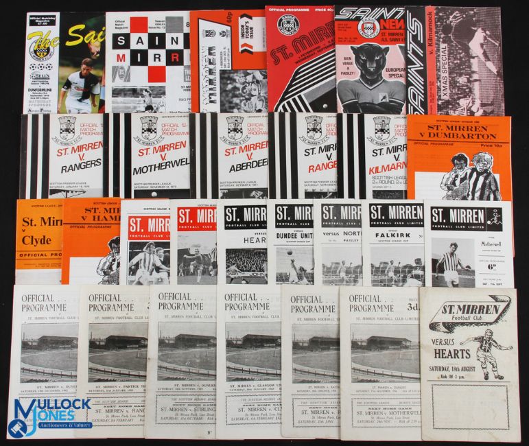 Selection of St Mirren home programmes 1951/52 Hearts (SLC), 1956/57 Dundee, 1957/58 Raith Rovers, 1958/59 Partick Thistle (SC), 1959/60 Dundee, Glasgow University (score 15-0), 1962/63 Dundee, 1965/66 Falkirk (SLC), Northampton Town (Paisley Cup), 1968/69 Motherwell (SLC), 1969/70 Dundee Utd (SLC), 1970/71 Hearts, 1971/72 Queens Park, 1974/75 East Fife, 1975/76 Clyde, 1976/77 Hamilton, Dumbarton, 1977/78 Kilmarnock (SLC), Rangers, Aberdeen, Motherwell, Rangers, 1979/80 Kilmarnock, 1980/81 St. Etienne (UEFA), 1983/84 Feyenoord (UEFA), 1987//88 Hibernian, 1990/91 Hibernian, 1994/95 Dunfermline; fair. (28)