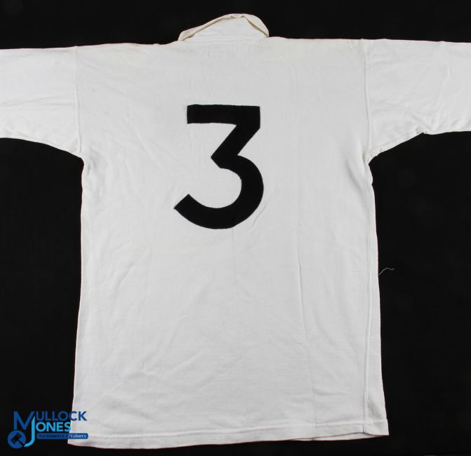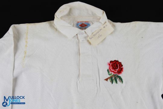 Scarce Phil Blakeway's 1981 match worn English Rugby Jersey: Lovely Umbro 44" chest white jersey with English Rose badge to breast & black 3 to rear, a few marks to shoulder but generally VG and a great collectable example. Presented by the 19 times capped Gloucester prop to a major Irish collector, perhaps after England's Dublin win that year, & following his 1980 Grand Slam success