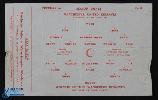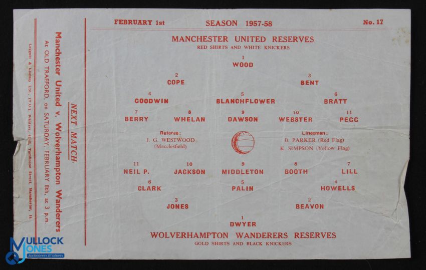 1957/58 Manchester Utd v Wolverhampton Wanderers reserves 1st February 1958 (programme no. 17) last match at Old Trafford before the disaster; has crease, token intact. (1)