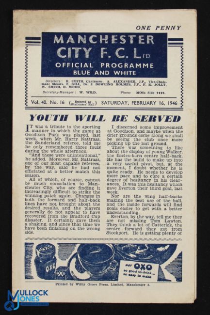 War-Time 1945/1946 Manchester City v Everton War League North 16 February 1946, 4 pages; fair. (1)