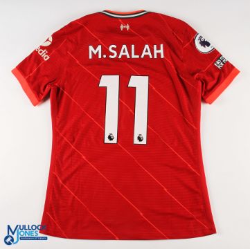 Mo Salah No 11 Liverpool 2021/22 match issue home football shirt - Nike/Standard Chartered, PL and Expedia sleeve badges, size L, short sleeve