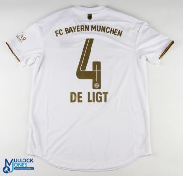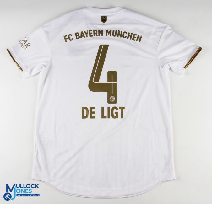 Matthijs de Ligt No 4 Bayern Munich 2022/23 away match issue football shirt - in white, Adidas / T Mobile, Bundesliga and Qatar sleeve badges, size 7, short sleeve