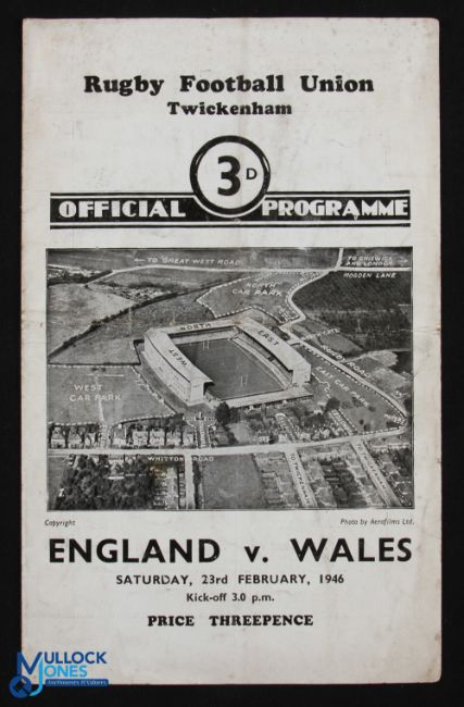 1946 England v Wales Victory Match Rugby Programme: England lost 3-0 to Wales at Twickenham, Feb 1946. G, some marks