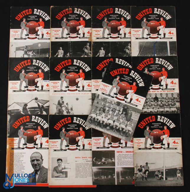 1956/57 Manchester Utd. home match programmes Anderlecht (1st home European Cup match), Manchester City, Charlton Athletic, Everton, Cardiff City, Chelsea, Aston Villa, poor), Bolton Wanderers (opening of floodlights, tc, tm), Atletico Bilbao, Tottenham Hotspur (good), Sunderland (creased), WBA (heavy Sellotaped spine, loose covers), United presented with Div. 1 Trophy after this match; varied condition. (12)