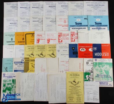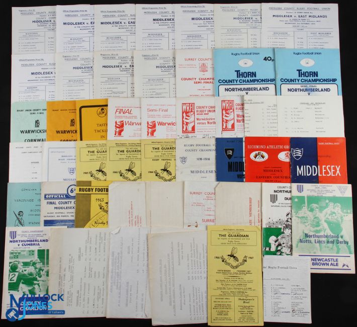 County Championship etc Rugby Programmes (50+): Another glorious group, inc the Finals of 1952, 56, 58, 68 & 72, some semis from 62, 66, 71, 72, 74 & 80, and 40 other homes from Middlesex (& one away at Vancouver Island!) Warwicks, Surrey, Northumberland, Hants & Cumbria & Westmoreland (2 away). Mostly G/VG, not to be missed