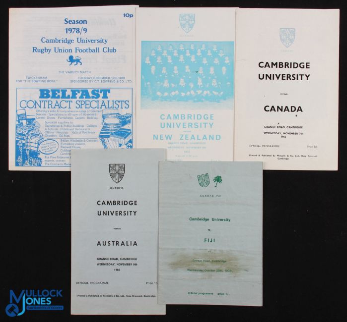 Cambridge Univ v Tourists Rugby Programmes (5): The Light Blues v Canada, 1962, Fiji (worn), 1970, Australia 1966 & NZ 1972 & 1978. Mostly VG
