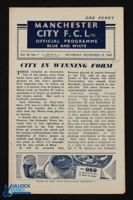 War-Time 1945/1946 Manchester City v Bury War League North 10 November 1945, 4 pages; team changes, overall fair. (1)