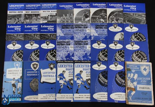 Collection of Leicester City homes to include 1953/54 Everton (Sellotape, poor), 1956/57 Notts. County (ph), WBA (Sellotape spine), 1958/59 Lincoln City (FAC), 1959/60 WBA (tear), 1960/61 Birmingham City, 1962/63 Burnley, Fulham, 1963/64 Sheffield Utd, Leyton Orient (FAC), WHU, All Stars XI (Trautmann, Howe, Whitefoot, Charles, Flowers, Finney, Dougan, Rowley (A) etc.), 1964/65 Birmingham City, Blackburn Rovers, Liverpool (FAC), Stoke City, 1965/66 Blackpool, Fulham, Nottingham Forest, 1966/67 Blackpool, Nottingham Forest, 1967/68 Sheffield Wednesday, Sunderland, Coventry City, Rotherham Utd (FAC), 1968/69 Southampton, Coventry City, Newcastle Utd, Stoke City, 1969/70 Bolton Wanderers, WBA (FLC), Sheffield Utd; fair. (32)