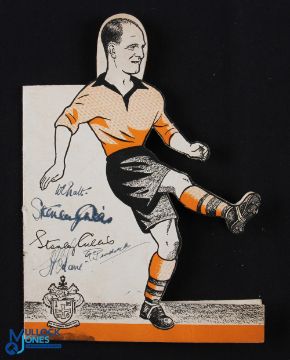 1949 Wolverhampton Wanderers FA Cup winning celebration menu featuring Billy Wright and Stan Cullis in the form of caricatures in Wolves Kit, full autographed by Stan Cullis, Billy Wright, Charles Buchan plus many guests and dignitaries (40+signatures in total), fair condition for this original item. (1)