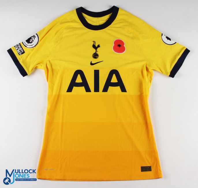 Son Heung-min No 7 Tottenham Hotspur 2020/21 'Poppy' third match issue football shirt - in yellow, Nike / AIA, Premier League No Room for Racism sleeve badges, size M, short sleeve