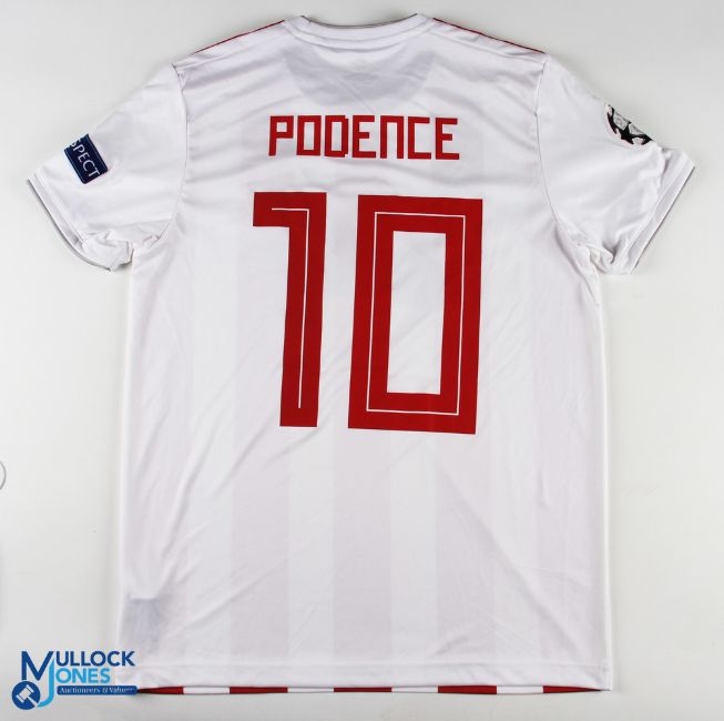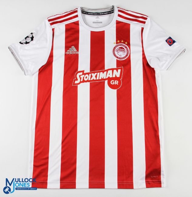 Daniel Podence No 10 Olympiacos Piraeus 2019/20 Champions League home match issue football shirt - in red and white, Adidas / Stoximan, Champions League and Respect sleeve badges, size M, short sleeve