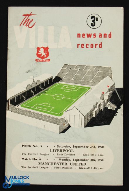 1950/51 Aston Villa double issue programme v Liverpool (2nd September 1950) plus v Manchester Utd (4 September 1950), Liverpool team photo inside; fair/good. (1)
