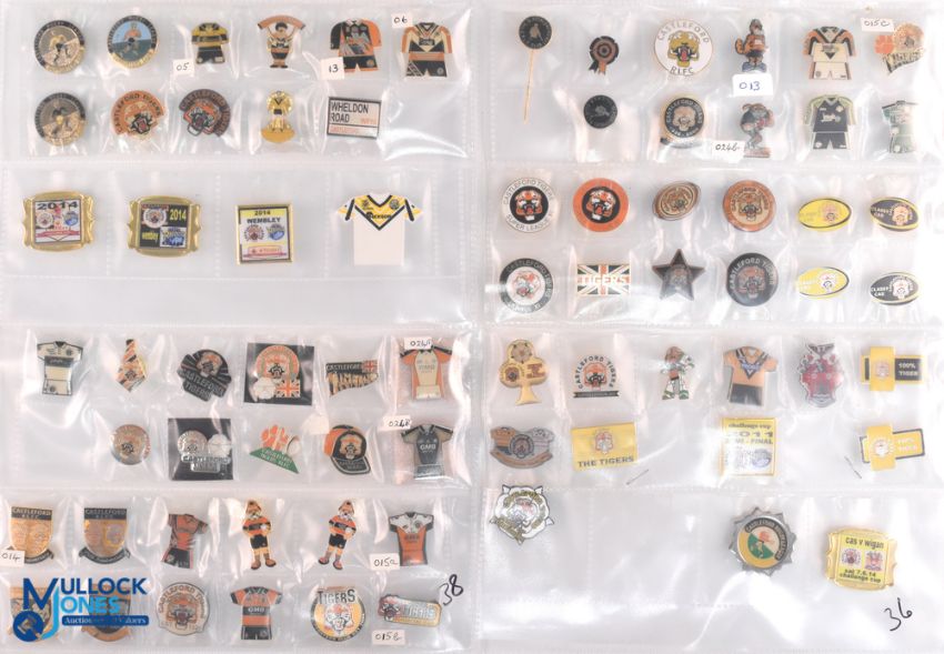 Quantity of Castleford Tigers Rugby League enamel badges to incl' Grand Final, Supporters Club, 75th anniversary, Super League XI, Castleford Tigers, Challenge Cup etc, varying styles, shapes and sizes (#154)
