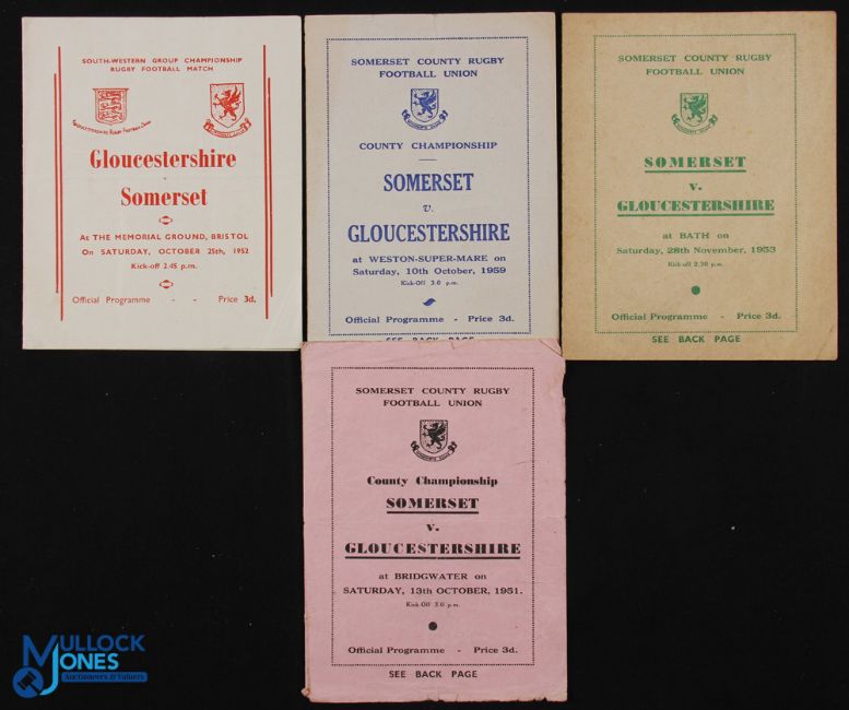 Somerset/Glos 1950s County Rugby Programmes (4): Somerset v Glos 1951 (poor), 53 (f/g), 59 (fold); Glos v Somerset 1952 (good). Nice lot