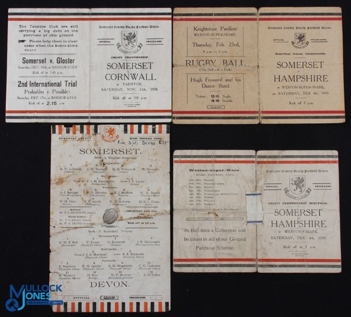 Rare 1920s/30s County Championship Rugby Programmes (4): Somerset v Devon 1929, Cornwall 1938 & Hampshire 19333 & 1939. Mixed conditions but wholly collectable