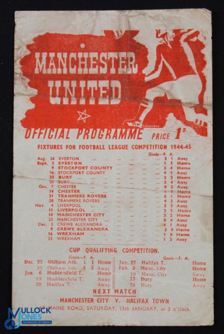 War Time 1944/45 Manchester Utd v Huddersfield Town League Cup qualifier 6 January 1946, single sheet, fair at best. (1)