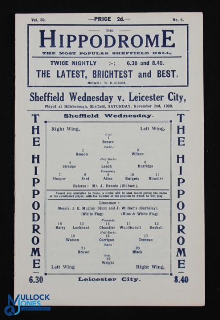 Pre-War 1929/1930 Sheffield Wednesday v Leicester City Div. 1 match programme 2 November 1929; ex. b.v. but spine strong, overall fair/good. (1)