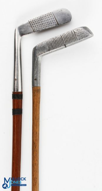 M J Lewis patent perfect metal blade putter with oval 4.5" hosel and dangawood shaft and square grip end, t/w with a Double XX alloy upright mallet head putter with lead weights to the sole and sloping back crown, and flat thumb panel to hickory shaft - both gripped (2)