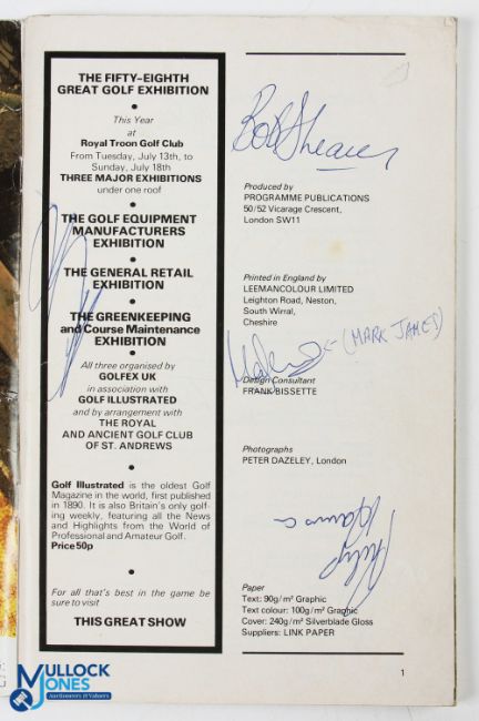 1982 Official Royal Troon Open Golf Championship Multiple Signed Programme - signed by 17 players to incl Arnold Palmer, Roger Chapman, Jay Haas, Craig Stadler, Mark James, Mark McNulty, Bob Shearer, et al come with handwritten list of players signature Note: From The Estate of The Late David Easby