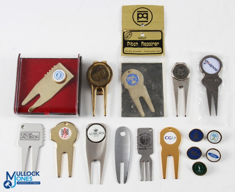 Collection of Golf Pitch Repairing Forks and Golf Ball Markers (16) 11x pitch repairers to incl Turnberry, Woburn, St Pierre, European Senior Tour, Oscar Jacobson, PGA, World Open Golf Hall of Fame Pinehurst et al plus 5x ball markers 2 Royal Jersey GC, Irish Open Championship, PLM Open and Ford Note: From The Estate of The Late Tommy Horton MBE, Former Ryder Cup Player and PGA Captain