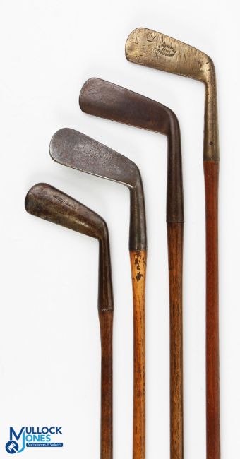 4x Gutty Period Golf Clubs - to incl' round back cleek by George Nicol Leven stamped the FG Tait cleek, Lofted iron without maker's marks, George Forrester of Elie thick brass straight blade, and another by Forrester with indistinct stamped metal straight blade both with 4.5" hosels - all fitted with grips