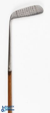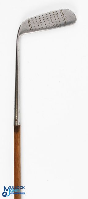 W G Oke patent long slim 8" hosel straight blade metal putter showing the Oke brand cleek mark and stamped 2M, fitted with full length grip