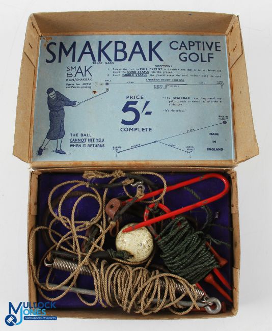 Smakbak Captive Golf Practice Aid - c/w the original Smakbak square mesh golf ball (used, both red enamel cord staples, spring and cord - all original in makers hinged box Note: From The Estate of The Late Tommy Horton MBE, Former Ryder Cup Player and PGA Captain