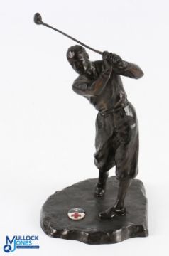 1940s Bronzed Spelter Golfing Figure in the style of Bobby Jones - produced during WWII to raise funds for St Johns Ambulance and Red Cross - mounted on a naturalistic base with enamel motifs - overall 9"h.