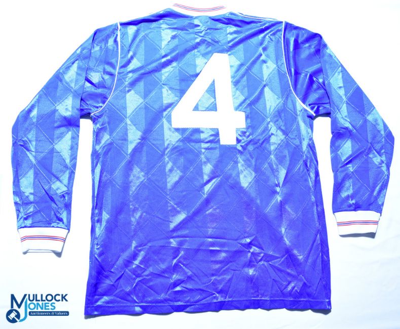 1989 Macclesfield Town FC Home football shirt -in blue FA Trophy Final Wembley. Umbro Size XL. HFS Long sleeves. Hole to sleeve, signs of wear