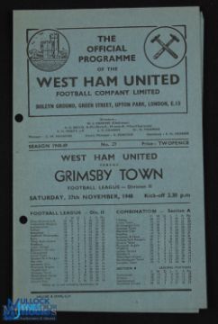 1948/49 West Ham Utd v Grimsby Town Div. 2 match programme 27 November 1948, match abandoned; neat punch holes, team changes.