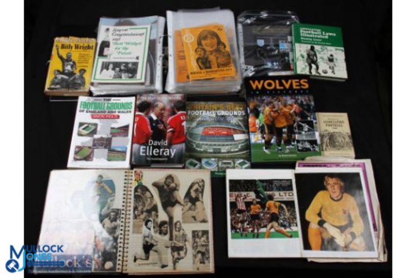 Collection of Wolverhampton Wanderers memorabilia to include home match programmes 1969-1977 (86) to include 1976/77 Manchester City (centenary match), 1975/76 Liverpool (championship decider), 1975/76 Leeds Utd (Jimmy Hill autograph), The Doog 1957-1975 (Dougan autograph), 1975/76 Dougan testimonial, 1973/74 Norwich City FLC s/f (signed by Sammy Chung, Mike Bailey, John Richards, Phil Parkes), 1973/74 Manchester City (Geoff Palmer autograph), 1972/73 Bristol Rovers FLC (Danny Hegan autograph), 1971/72 Sheffield Utd (Steve Daley autograph), 1970/71 Morton (Texaco), 1970/71 Ron Flowers XI (testimonial); also has the following match tickets 1974/75 Fulham (2), 1973/74 Southampton, Chelsea, Sheffield Utd, 1971/72 Chelsea, WHU, Liverpool, Manchester City, 1970/71 Liverpool, Ron Flowers XI, 1969/70 Tottenham Hotspur; plus away programmes 1987/88 Burnley (Sherpa Van trophy) 1980/81 Spurs (FAC s/f), 1993/94 Kispest Honved (friendly), 1997/98 Arsenal (FAC s/f),, 1973/74 Manchester City (FLC final); book - Wolves in Pictures 2007, Wolves 1970s scrapbook (has autographs), Wolves Supporters club scrapbook 1970s (+ autographs), book- Captain of England 1950 Billy Wright (complete with autograph), 1863 Association Football Rules (small book from 2006), book - Britain's Best Football Grounds s/b 2008, book - Football Laws Illustrated (1970), book - Man in the Middle - David Elleray 2004 (with autograph), book (1984) Football Grounds of England & Wales (Inglis) (a lot)
