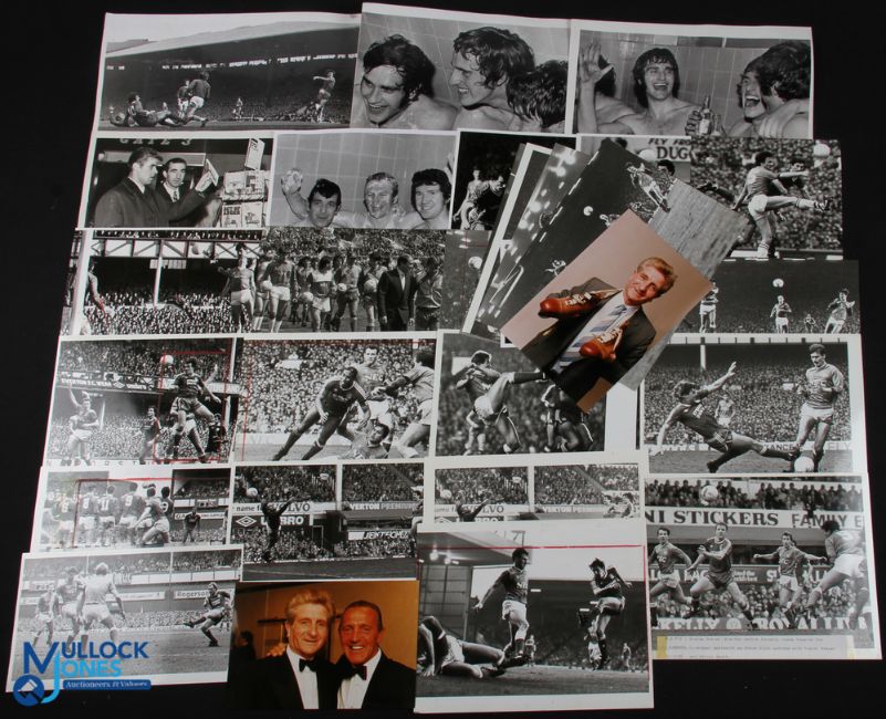Photographs: Liverpool b&w press photographs generally match action, 1971 players in bath post match (3), 1971 FAC s/f Brian Hall scoring winning goal, 1965 Alf Arrowsmith and Gerry Byrne at airport on the way to Juventus, 1984 Rush heads a goal, Mountfield (Everton) blocks a shot, 1986 FAC final Liverpool/Everton players walk out on the pitch, 1988 a collection of Liverpool action photos including John Barnes, Ray Houghton, McMahon shoots (Everton), Kenny Dalglish in suit, Johnston shoots, Barry Venison tackles an Everton player, plus many others all 1980s, and 1990s in colour (2); o/all good. (31)