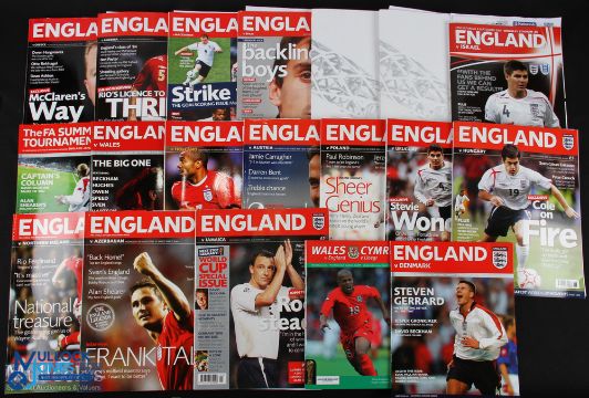 Collection of England international home match programmes to include 2003 Denmark; 2004 Japan/Iceland (summer tournament) and Japan team sheet, car park pass, boardroom suite level 2 x2; 2004 Wales (WC) and team sheet and directors box tickets and VIP lounge ticket; 2005 Holland and team sheet and directors box ticket (pinned in); 2005 Northern Ireland (WC) and team sheet and directors box tickets x2 and VIP tickets (pinned in); 2005 Azerbaijan (WC) and team sheet and directors box tickets x2 (pinned in); 2005 Wales (WC) at Cardiff and ticket and England fanzine; 2005 (WC) Austria and team sheet and directors box ticket and VIP lounge ticket (all pinned in) and menu/table of events; 2005 Poland (WC) and team sheet and directors box ticket and VIP lounge ticket and car park ticket (pinned in); 2006 Uruguay and team sheet and directors box ticket and trophy room dinner ticket (pinned in) and menu/table of events; 2006 Hungary and team sheet and directors box tickets x2, VIP tickets x2 (all in a wallet) and menu/table of events; 2006 Jamaica and team sheet and directors box ticket and VIP tickets x2 and menu/table of events, signatures to programme include Mark Lawrenson, Alan Hansen, Ian Wright, Gary Neville, Peter Beardsley, Nancy Del Olio (Sven's girlfriend), 2006 Greece and team sheet and directors box tickets x2, and VIP lounge tickets x2 (all pinned in); Andorra (Euro 2006 and team sheet x2, and directors box tickets x2, and VIP lounge tickets x2 and menu/table of events; 2006 Macedonia and team sheet and directors box tickets x2, VIP lounge ticket (all pinned in); 2007 Spain and team sheet and FA tickets x2, and VIP ticket (pinned in) and menu/table of events; 2007 Brazil and team sheet and Royal box tickets x , and Wembley Suite tickets x2 (in wallet) and menu/table of events all in official FA pack; 2007 Germany (1st England match at New Wembley) and team sheet (creased and Royal box ticket and Wembley Suite ticket (pinned in), programme has signatures of the German party Franz Beckenbauer, Uwe Seeler, Berti Vogts, German FA president and Martin Peters, in official FA pack; 2008 Israel (Euro 2008) and team sheet and Royal box ticket and VIP lounge ticket (pinned in), menu/table of events, programme has signatures of Mark Hughes, Sir Trevor Brooking, John Motson, Mark Lawrenson, Alan Curbishley, Gary Mabbut F/G (a lot)