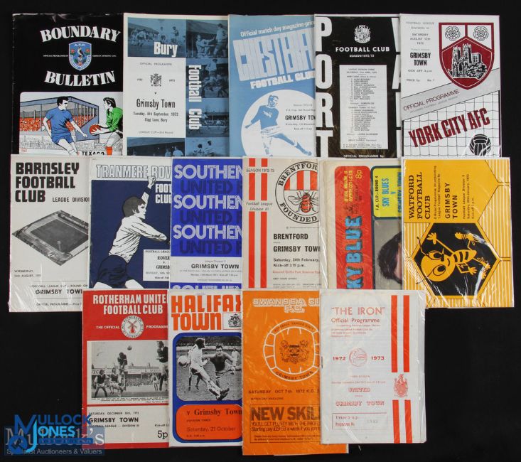 1972/73 Collection of Grimsby Town (Lawrie McMenemy era) Div. 3 away match programmes to include Port Vale, Tranmere Rovers, Southend Utd, Brentford, Coventry City, Watford, Rotherham Utd, Chesterfield (FAC), Halifax Town, Swansea City, Scunthorpe Utd, Oldham Athletic, Bury (FLC), Barnsley (FLC), York City, fair/good condition. (15)