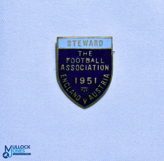 1951 The Football Association Steward FA Enamel Badge, International Match Friendly England v Austria (2-2) pin backed