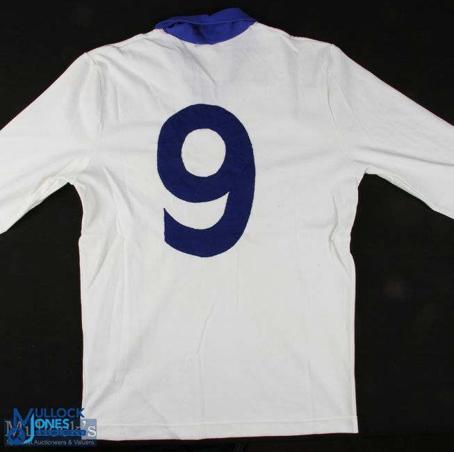 1976 Finland international match shirt v England 13 June 1976 in Helsinki, World Cup qualifier match, white jersey with blue collar, SUOMI 1907 shirt badge, No. 9 to the back (Aki Heiskanen) the player; card signed by Paul Madeley as provenance