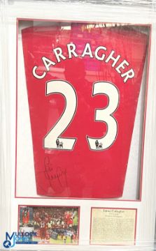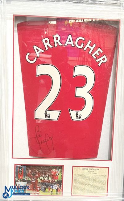 Jamie Carragher signed Liverpool home replica football shirt in red, signed to the reverse, Carragher #23 to reverse, finely presented and professionally framed, measures 98x66 cm approx.