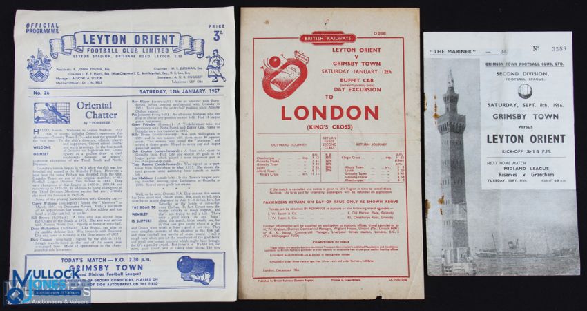 1956/57 Grimsby Town, British Rail Day Excursion card January 12th to London Kings Cross for match v Leyton Orient plus match programme also includes home match programme v Leyton Orient (8 September 1956). F (3)