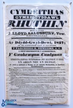The Welsh Society of Ruthin 1827 large printed Poster - advertising the Annual Ring Festival to be held on St. David's Day, extensive details including the Poetry Recitations for which monetary awards are to be competed for; the major prize being £4, all text in Welsh, good condition, creasing and small piece missing from central margin not affecting text