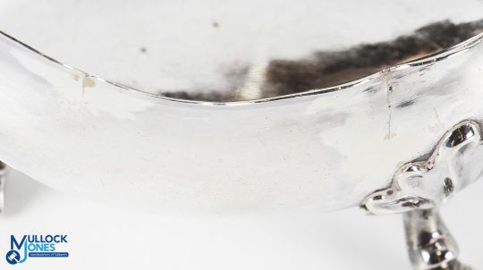 George II Pair of Hallmarked Silver Sauce Boats by William Shaw & William Priest 1755 each with wavy-edge rims, scroll handles with shell topped hoofed feet, each hallmarked London 1755 with makers mark for William Shaw & William Priest, length 18.5, total weight 530 grams (2)