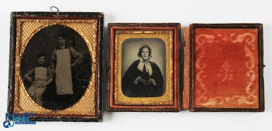 2x c1880 Ambrotype Photographs, with original cases, an image of a lady portrait with bonnet and gloves, a pair of industrial workers with aprons (2)