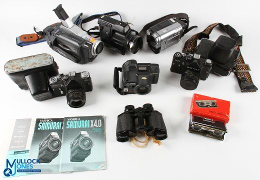 35mm Camera and Digital Video Cam collection, to include a Yashica Samurai X40, Sony Handycam, Sony Digital Handycam, Olympus Az300, Zenit TTL, Zenit EM, binoculars, and accessories