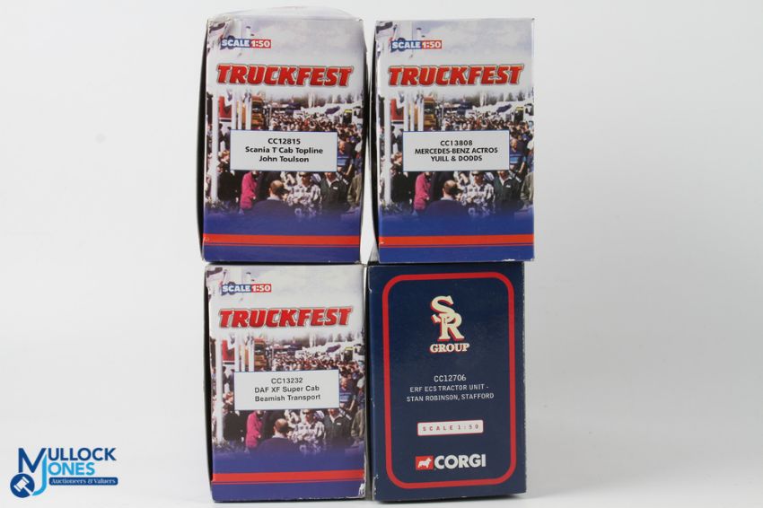 Corgi 1/50 Scale Diecast Lorry Cabs (4) - CC12815 Scania T Cab topline John Toulson, CC13808 Mercedes Benz Actros Yuill & Dodds, CC13232 DAF XF super cab Beamish Transport, CC12706 ERF ECS tractor unit Stan Robinson, Stafford, all boxed (4)