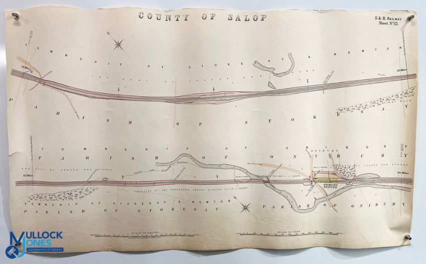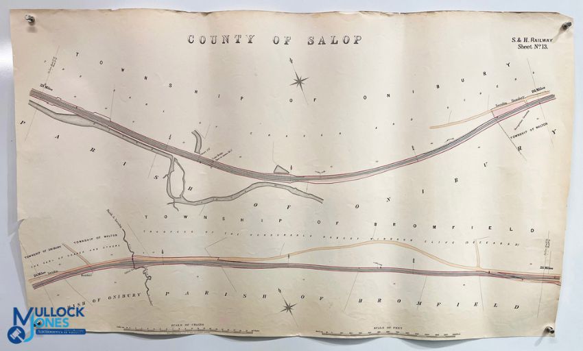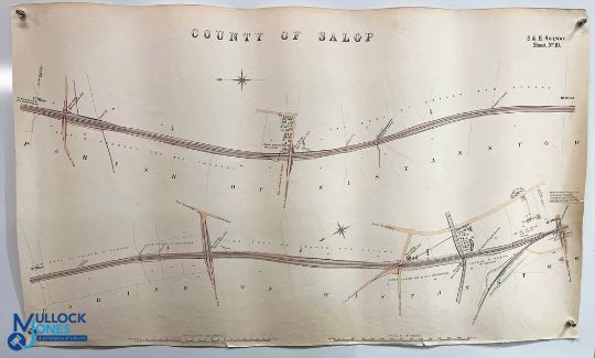 Shropshire - Railways - Original Plans five original large scale plans for the Shrewsbury to Hereford railway between Craven Arms and just north of Ludlow, drawn on a scale of 10 inches to the mile. The line has been highlighted in colour. The maps show the ownership of the land on either side as well as a wealth of other features including the station and marshalling yards at Craven Arms, and a section of the now long abandoned Bishop's Castle Railway, showing its junction with the main line. No date but probably 1860. Each map measures approx. 660x710mm, printed on thick paper, a few close tears (easily repairable in our view). Rare