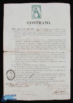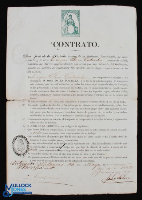 1871 Work Contract [Contrato] for an emancipated African slave - between a Don Jose de la Postilla and Elena Catumbu, with details on payment of 8 pesos per month, and from the Government remains in the position of freely working, printed and completed by hand, dated 25 May 1871 - signed to the bottom, centre folds apparent with tears along fold , overall G condition