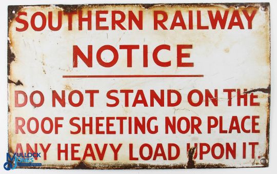 SR Enamel Sign - Southern Railway Notice - Do Not Stand on Roof - sheeting with wear - size 32cm x 51cm a good original sign