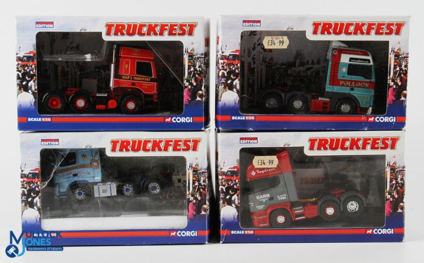 Corgi 1/50 Scale Truckfest Diecasts (4) - CC14004 Volvo FH J G McWilliam Ltd, CC13702 Scania R Series Garn Transport Ltd, CC13908 Foden Alpha Reids of Minishant, CC13704 Scania R Series Pollock (Scotrans) Ltd, all boxed (4)