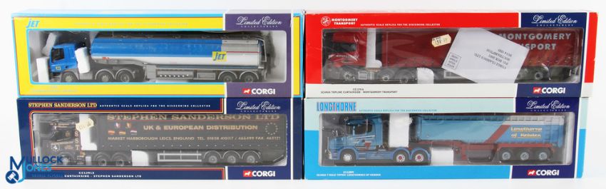 Corgi 1/50 Scale Lorries (4) - 75302 Leyland DAF petrol tanker Jet, CC12912 Scania topline curtainside Stephen Sanderson Ltd, CC12916 Scania topline curtainside Montgomery Transport, CC12809 Scania T bulk tipper Longthornes of Hebden, all boxed (4)